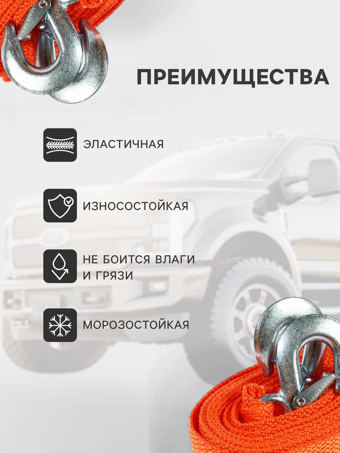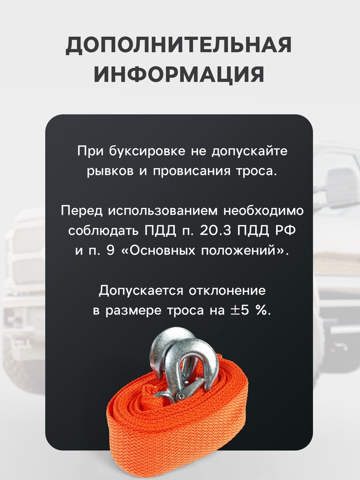 - Длина троса составляет 4,5 метра, что обеспечивает достаточную дистанцию между автомобилями и предотвращает возможные столкновения. Два крюка на концах троса обеспечивают надежное крепление к автомобилю и предотвращают соскальзывание.