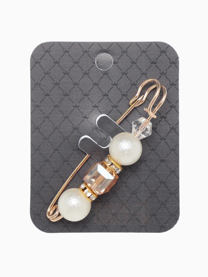 Изготовленная из прочного металла с золотистым покрытием, булавка украшена искусственным жемчугом и сверкающими стразами, что придаёт изделию лёгкость и благородство. Такой аксессуар универсален — он подходит как для повседневного ношения, так и для особых случаев, включая праздники и важные события.