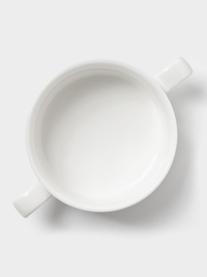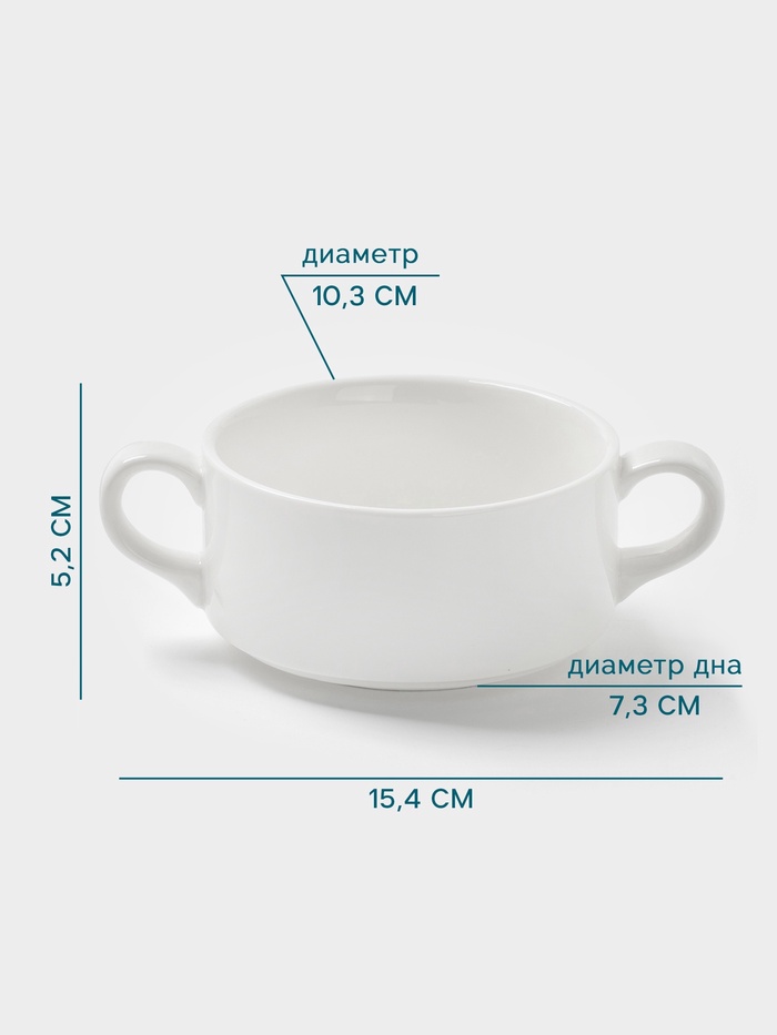 Фарфоровая бульонница объёмом 300 мл с удобными ручками сочетает в себе практичность и изящную простоту. Её классическая круглая форма диаметром 10,3 см и гладкая белоснежная поверхность создают атмосферу уюта и подчёркивают безупречность ервировки.