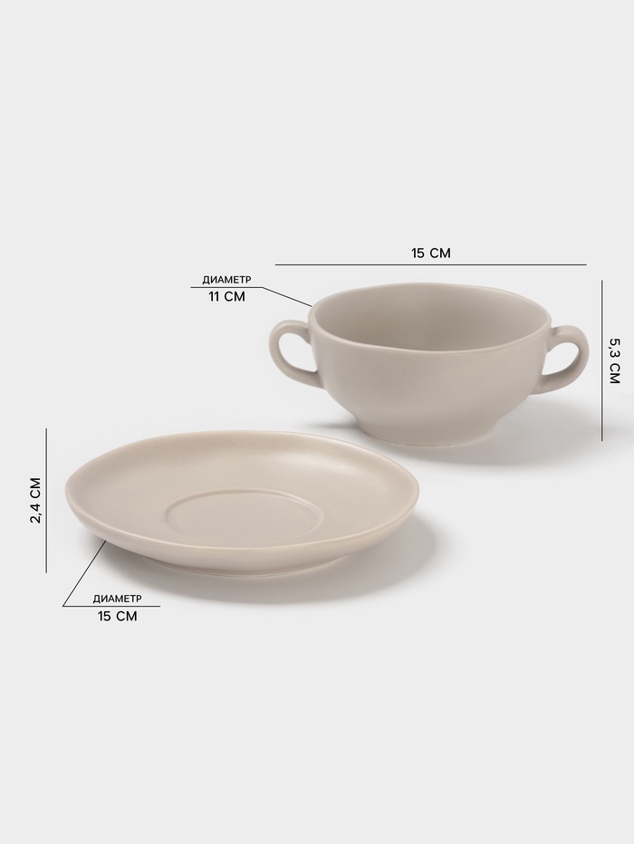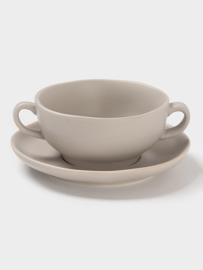 Элегантная светло-серая бульонница с блюдцем станет идеальным выбором для подачи горячих супов и бульонов. Объем 255 мл и фигурная форма делают её не только функциональной, но и стильной. Изготовленная из качественного фарфора, она легко впишется в любой интерьер благодаря своему однотонному дизайну.