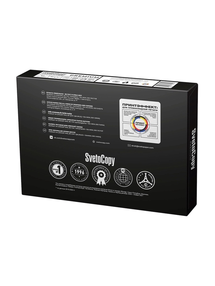 Бумага SVETOCOPY предназначена для повседневной работы в офисе. Обеспечивает отличное качество печати офисных документов на всех копировальных аппаратах и принтерах, независимо от их функционального назначения. SvetoСopy – бренд №1 в категории «Бумаги для офиса», а каждый второй потребитель офисной бумаги на вопрос о знании марок первой называет SvetoCopy*. Бренд появился на рынке в 1996 году, и SvetoCopy стала первой офисной бумагой, которая производится в России, а не импортируется из-за границы. SvetoCopy Premium премиальная белая бумага в абсолютно черной пачке. Она относится к категории качества «B», производится с использованием технологии ColorLok® и обладает высоким уровнем белизны - 162%. SvetoCopy Premium можно доверить самые важные документы и договоры, организовать эффективную работу руководителя. Бумага подходит для всех видов офисного оборудования и гарантирует премиальное качество отпечатков, которое поможет поддержать имидж и престиж вашего бизнеса.* Источник: исследование IPSOS «Оценка здоровья брендов», 2017