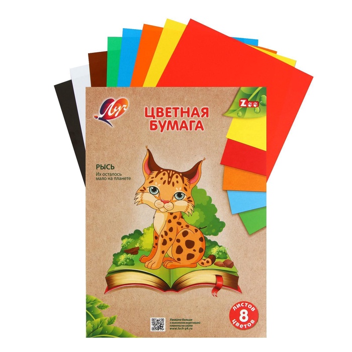 Бумага цветная А4, 8 листов 8 цветов «Луч» Рысь, блок 70 г/м²