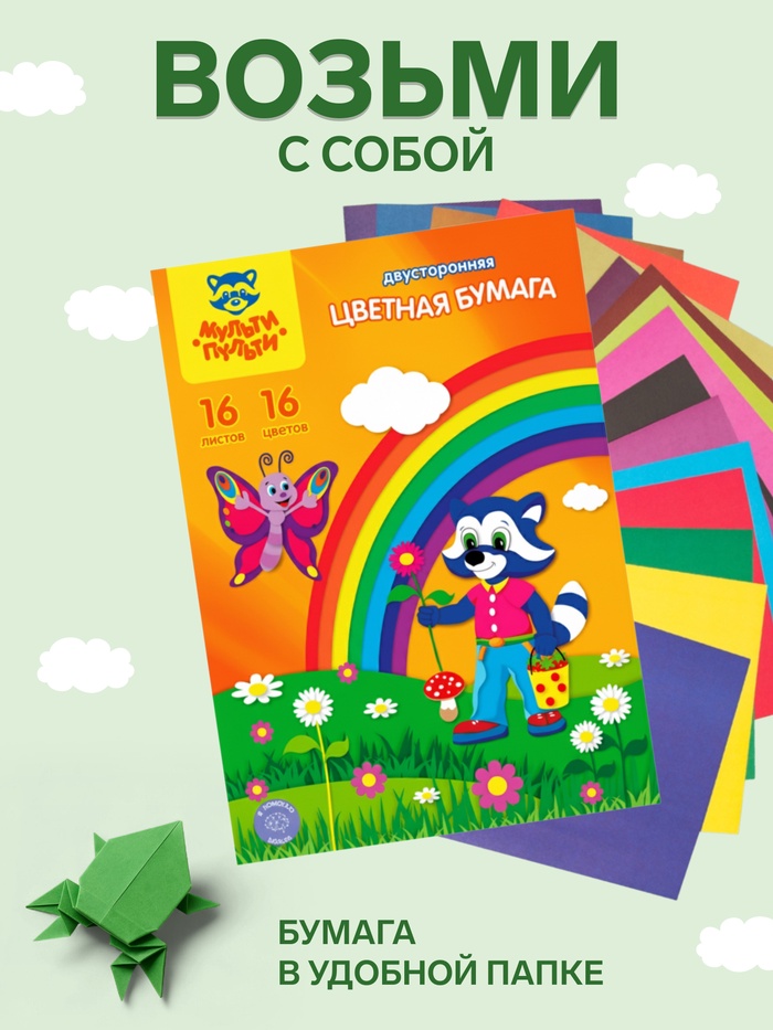 Бумага цветная двухсторонняя A4, 16 листов, 16 цветов Мульти-Пульти, в папке, плотность 65 г/м²