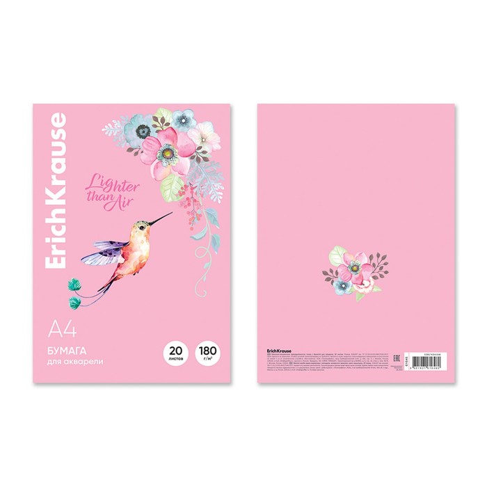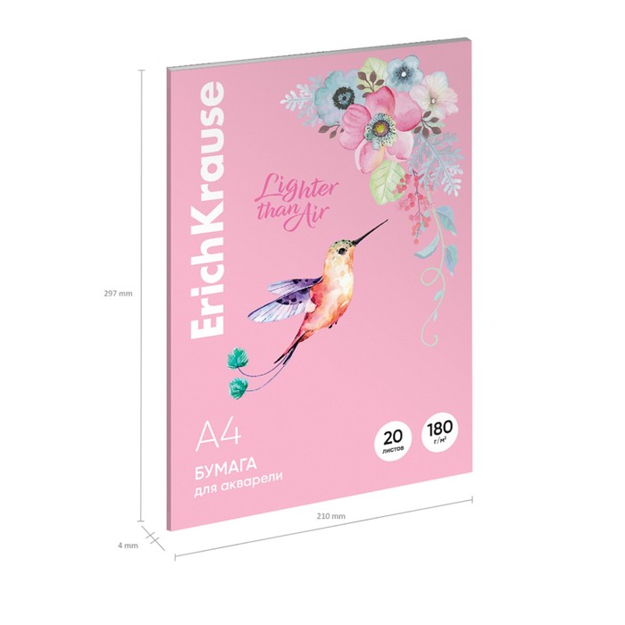 Бумага для акварели А4, 20 листов, ErichKrause "Колибри", блок 180 г/м², 100% белизна, в картонной папке