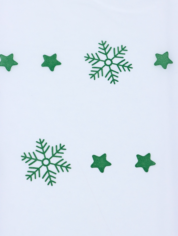 - Традиционный новогодний колорит: Зеленый цвет с узором из снежинок и звезд соответствует классической праздничной палитре. Односторонний принт экономно расходуется при оформлении.