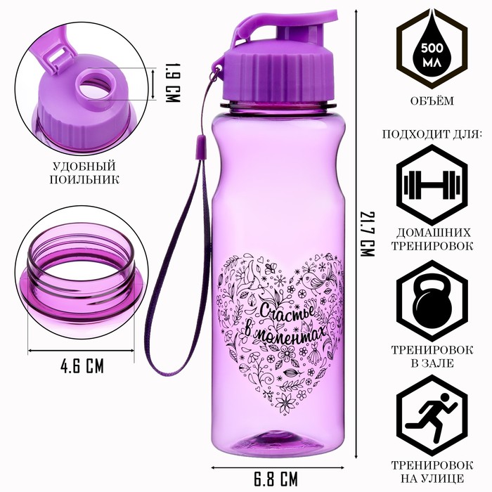 Бутылка объемом 500 мл (0.5 литра) предназначена для употребления воды, соков и других напитков. Отличный аксессуар для активного отдыха. Оригинальная форма, с захватом для пальцев, а также специальный ремешок обеспечивает удобство во время прогулок, тренировок и в спортивном зале. Изготовлена из безопасного, пищевого пластика, не содержит бисфенола-А. Продуманный дизайн для максимального комфорта: бутылка имеет герметичную крышку, что обеспечивает надежную защиту от проливания.