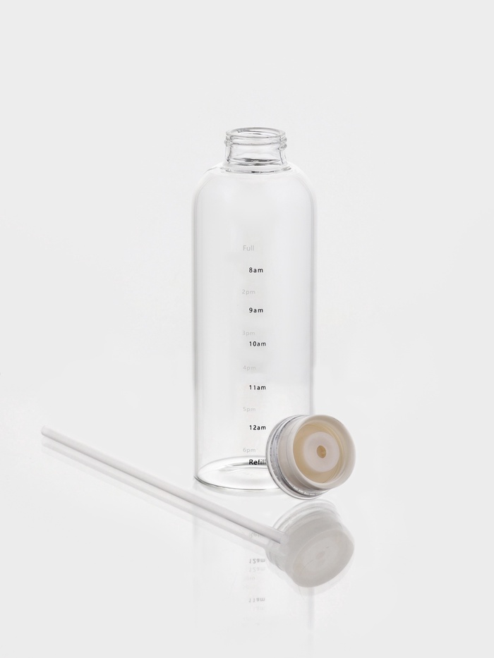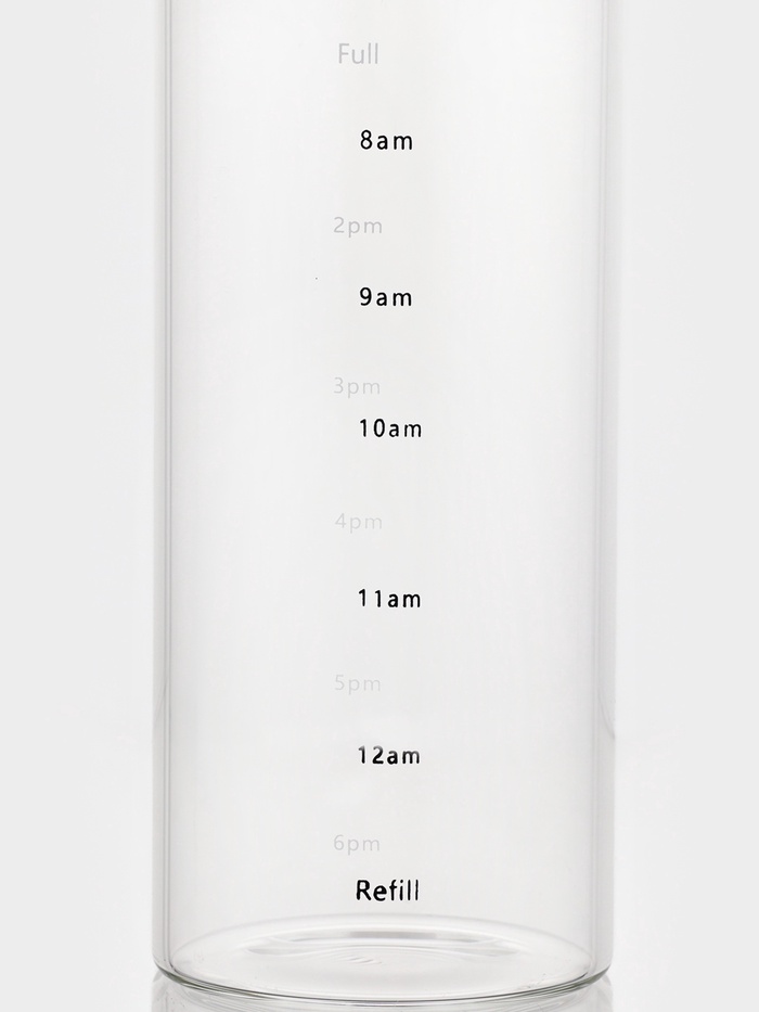 - Шкала времени: на корпусе нанесены временные метки от утра до вечера. Они показывают, сколько воды стоит выпить к определённому часу. Это работает без приложений — просто смотрите и пейте.