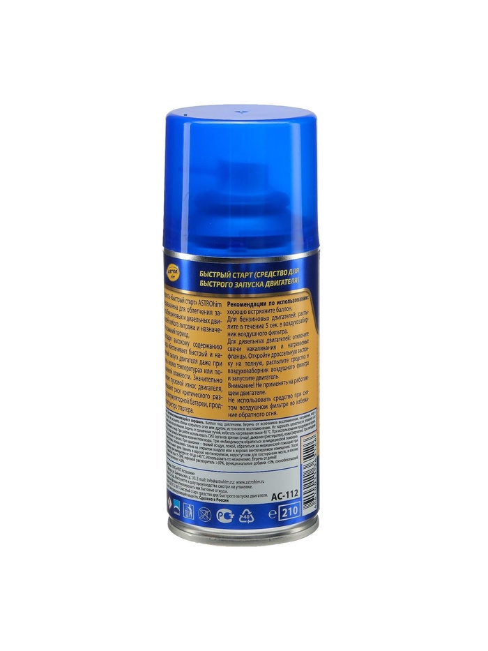 ASTROhim «Быстрый старт», 210 мл (АС-112) - аэрозольное средство для облегчения запуска бензиновых и дизельных двигателей в условиях пониженных температур, повышенной влажности или слабого заряда аккумулятора. Формула на основе эфиров и легко воспламеняемых компонентов обеспечивает быстрое воспламенение топливно-воздушной смеси, что особенно важно при зимней эксплуатации автомобиля.