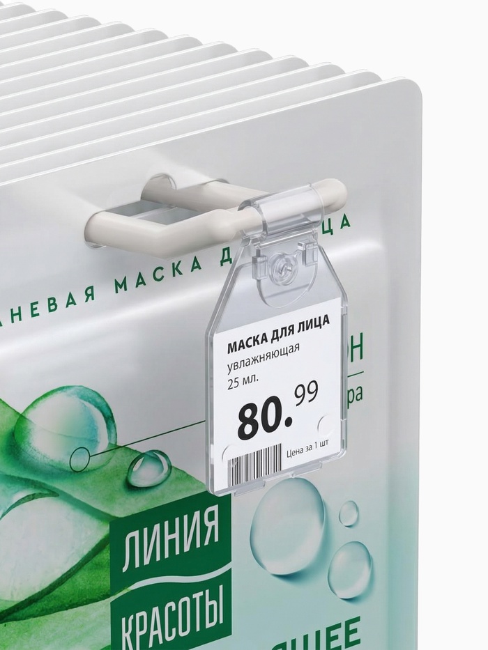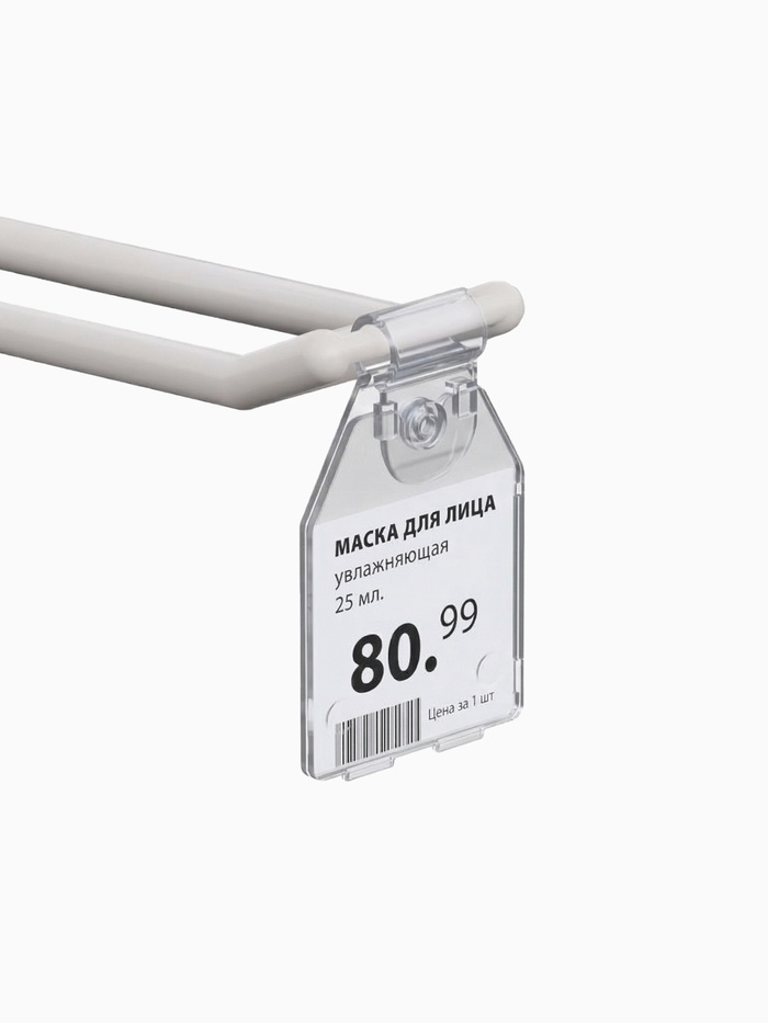 Откидной держатель ценника для двойных металлических или пластиковых крючков.
