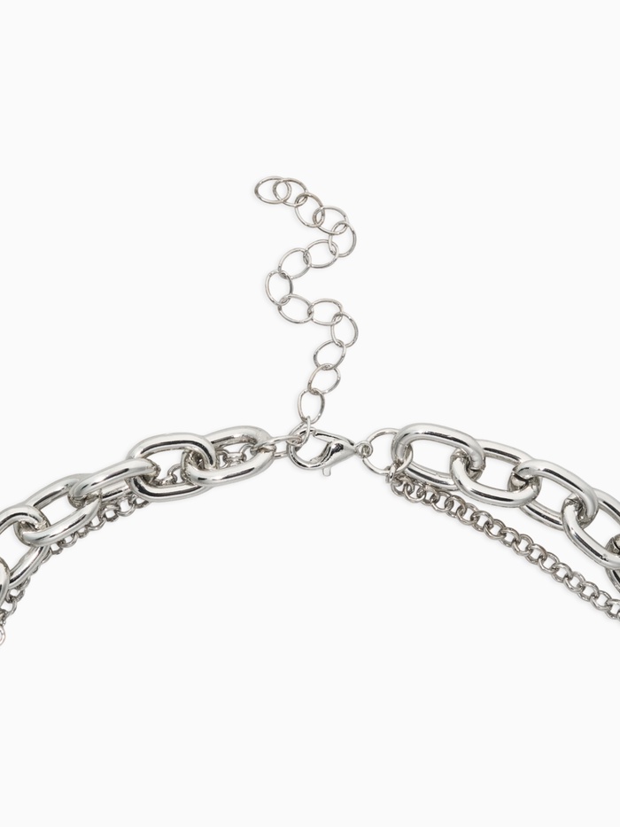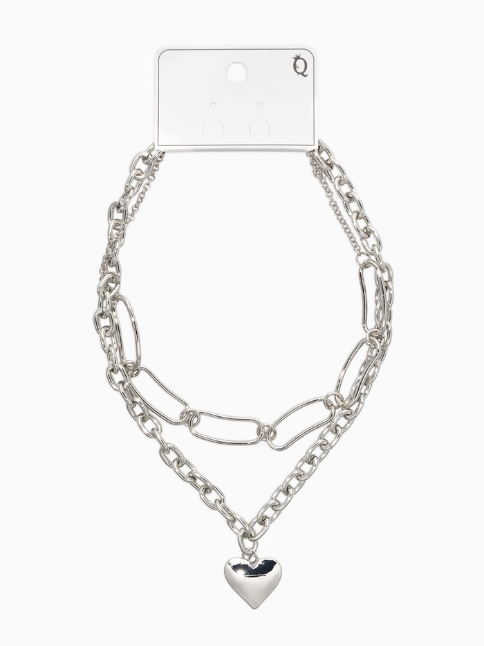 Двойной ярус этой серебристого цепи создаёт эффект многослойности, который так ценится в современном минимализме. Лаконичные металлические подвески в форме сердца идеально дополняют образ, придавая ему лёгкий акцент нежности и стиля.