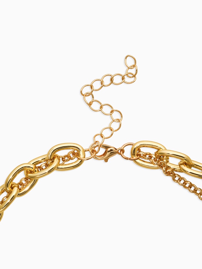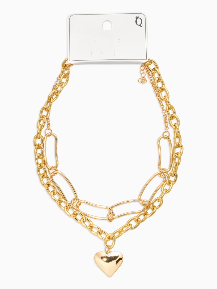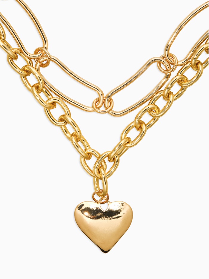 Двойной ярус этой золотистой цепи создаёт эффект многослойности, который так ценится в современном минимализме. Лаконичные металлические подвески в форме сердца идеально дополняют образ, придавая ему лёгкий акцент нежности и стиля.