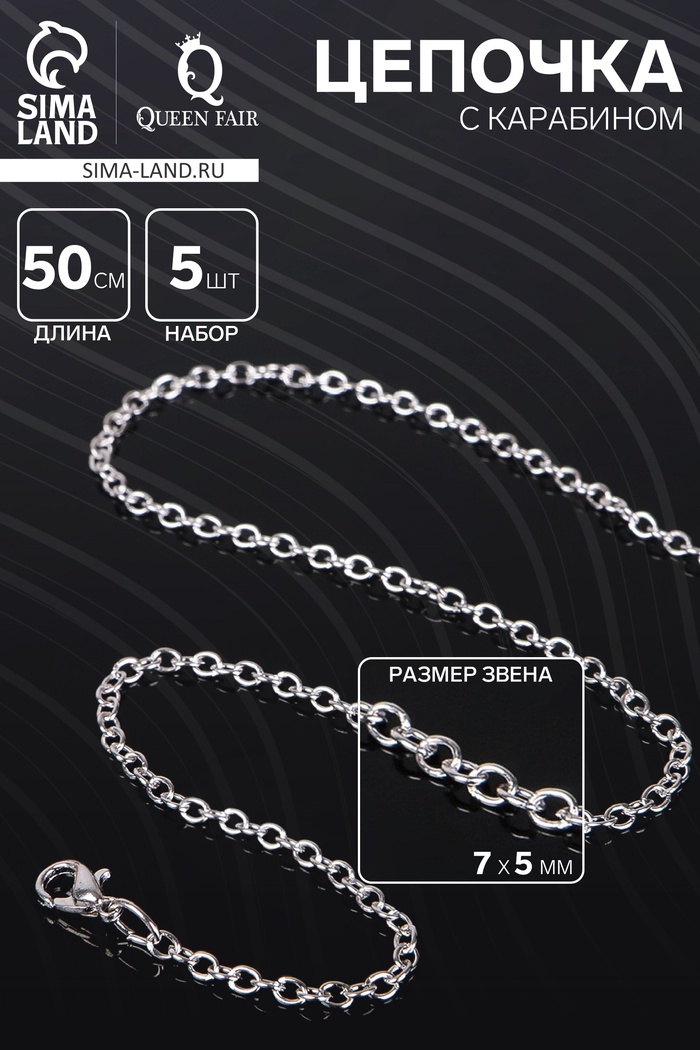 Цепочка с карабином L = 50 см (набор 5 шт), 7 х 5 х 1 мм, СМ-1935, цвет серебро — это стильная и прочная цепочка, которая идеально подходит для создания различных украшений, таких как ожерелья, браслеты и другие аксессуары. Карабин на конце цепочки обеспечивает надёжное закрытие, что делает её удобной для носки и долговечным элементом в ваших украшениях.