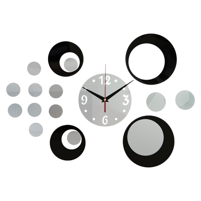 Создавайте часы в собственном стиле, проявляйте изобретательность и креативность. Не обязательно располагать числа по кругу — придайте аксессуару необычную форму, поменяйте диаметр циферблата, используйте не все элементы. Комплектующие легко клеятся на стену и без труда снимаются.