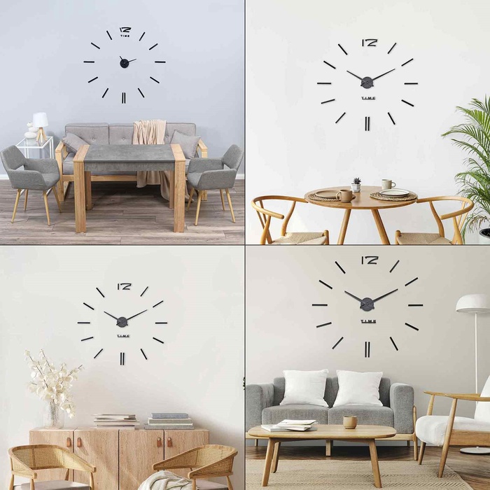 Оригинальные 3D часы-наклейка DIY диаметром от 65 см до 95 см черного цвета. Клеевой слой позволяет разместить часы на различные поверхности: окрашенные, деревянные, пластиковые, керамические или металлические, а также любые виды обоев. В комплекте к часам идет шаблон для разметки. С его помощью вы сами выбираете желаемый диаметр часов и делаете отметки на стене, куда будут клеиться элементы.