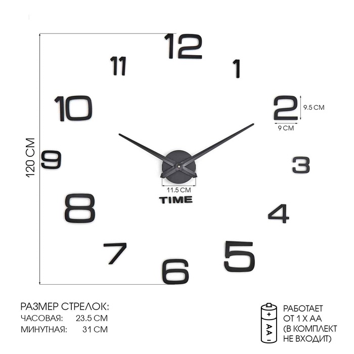 Оригинальные часы-наклейка имеют липкий слой, который позволяет разместить их на любой поверхности: обоях, дереве, пластике, керамике или металле. В комплект входит шаблон. С его помощью вы выберете нужный диаметр часов и сделаете отметки на стене, чтобы приклеить элементы.