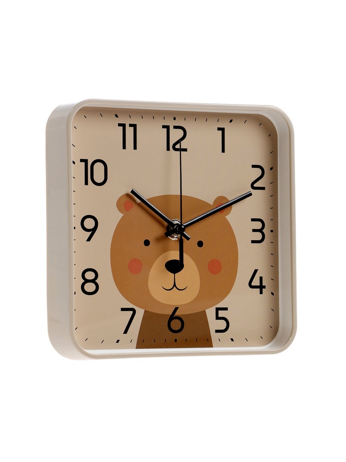 Квадратные настенные часы размером 19×19 см с изображением милого медвежонка на бежевом фоне воплощают нежность и игривость, идеально подходя для детских комнат или игровых зон. Кварцевый механизм обеспечивает плавный ход стрелок, а арабские цифры на циферблате делают отсчёт времени интуитивно понятным, помогая развивать чувство времени у малышей с раннего возраста.