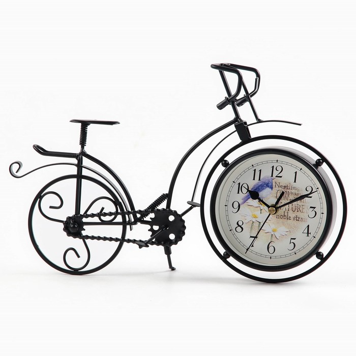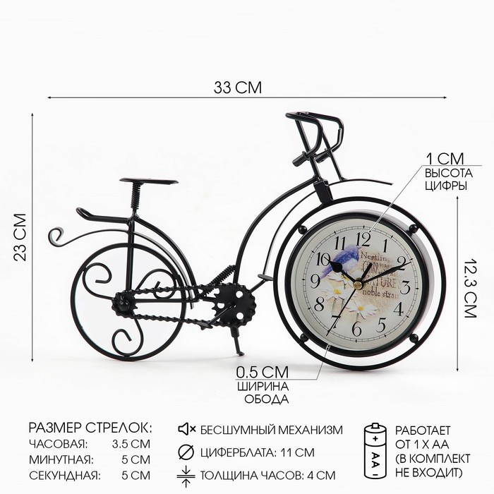 Часы с будильником представлены в оригинальном дизайне в форме велосипеда, они отлично впишутся в интерьер. Интерьерные часы станут прекрасным декором для дома и дачи, их можно поставить как на прикроватную тумбочку в спальне, детской комнате, гостиной так и на стол или на комод в зале, холле или на кухне. Будильник настольный имеет кварцевый механизм, который гарантирует высокую точность хода. Часы настольные обладают громким будильником, ребенку и вам будет комфортно просыпаться, на работу и в школу. Будильник на батарейках не требует частой замены батареек благодаря экономичному механизму.
