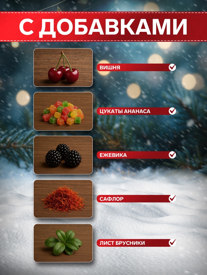 Фруктово-ягодный букет этого чая создает атмосферу праздника в обычный день. Вы завариваете его для семейных вечеров или в подарок друзьям — насыщенный вкус напоминает о новогодних угощениях. Такой чай становится поводом для теплой беседы и создает особенное настроение в холодное время года.
