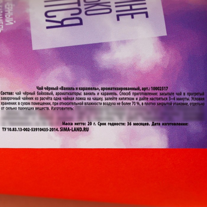 Состав: чай чёрный байховый, ароматизаторы: ваниль и карамель.