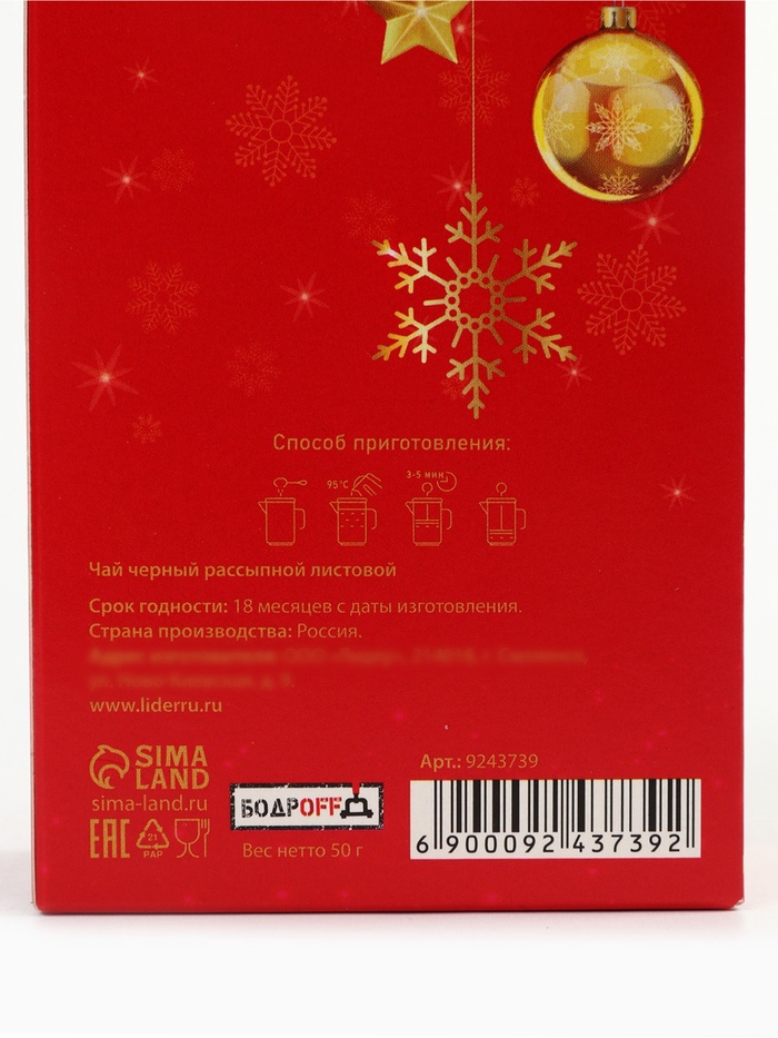 Для того чтобы насладиться всеми гранями вкуса, заварите чай в горячей воде (90-95°C) в течение 3-5 минут. Можно добавить немного меда или лимона для разнообразия. Чай упакован в стильную, праздничную упаковку, которая отлично подойдёт как для личного использования, так и в качестве оригинального подарка. Погрузитесь в атмосферу праздника с чаем "Новогоднее торжество", который станет незаменимым элементом ваших зимних вечеров и радостных встреч с родными и друзьями!