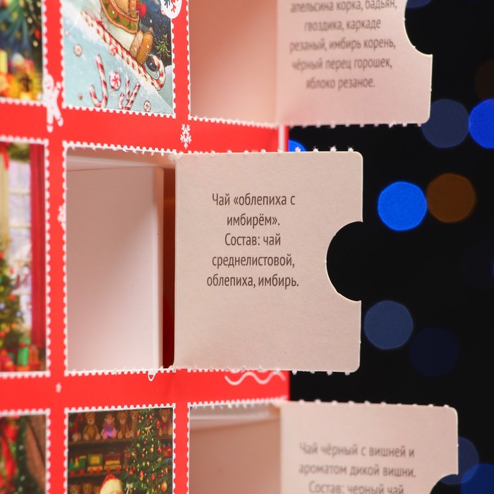 "Чайный адвент-календарь ""Новогодний очаг"" - это идеальный подарок на новогодние праздники. С помощью такого необычного календаря можно радовать себя 12 разными вкусами чая. Разместите сувенир на видном месте, например, на кухне или в гостиной, и каждый день вскрывайте по одной ячейке и наслаждайтесь потрясающим вкусом чая.