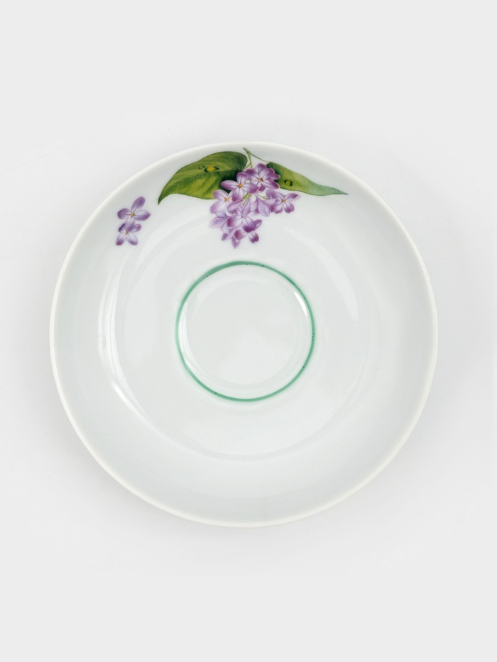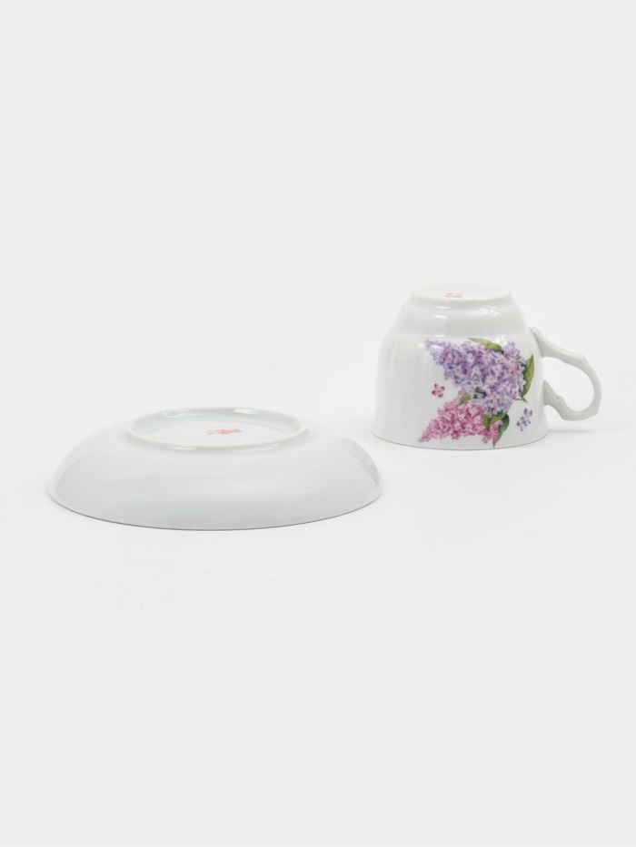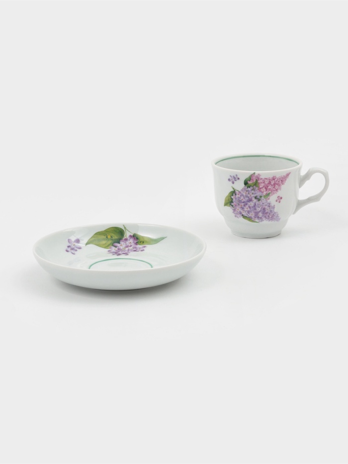 Чайная пара с росписью «Сирень» — чашка объёмом 250 мл и блюдце диаметром 15 см — наполняет чаепитие весенним настроением. Нежные соцветия на белом фарфоре напоминают о цветущем саде и создают уютную атмосферу за столом.