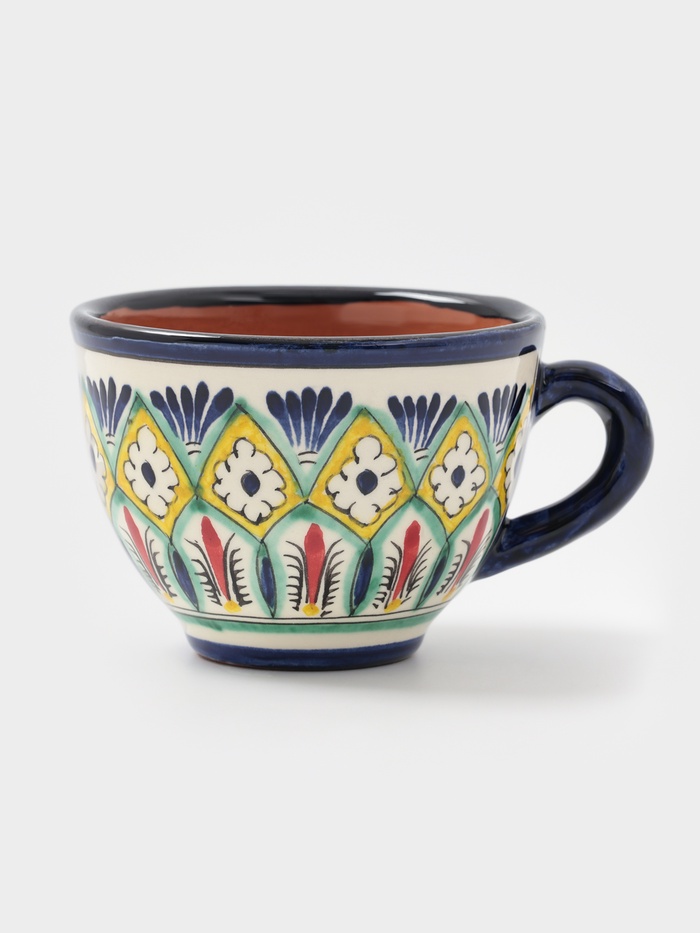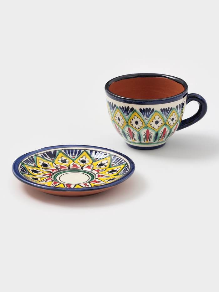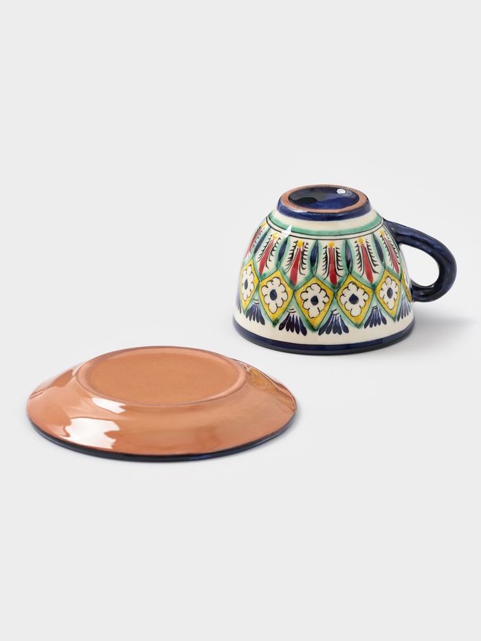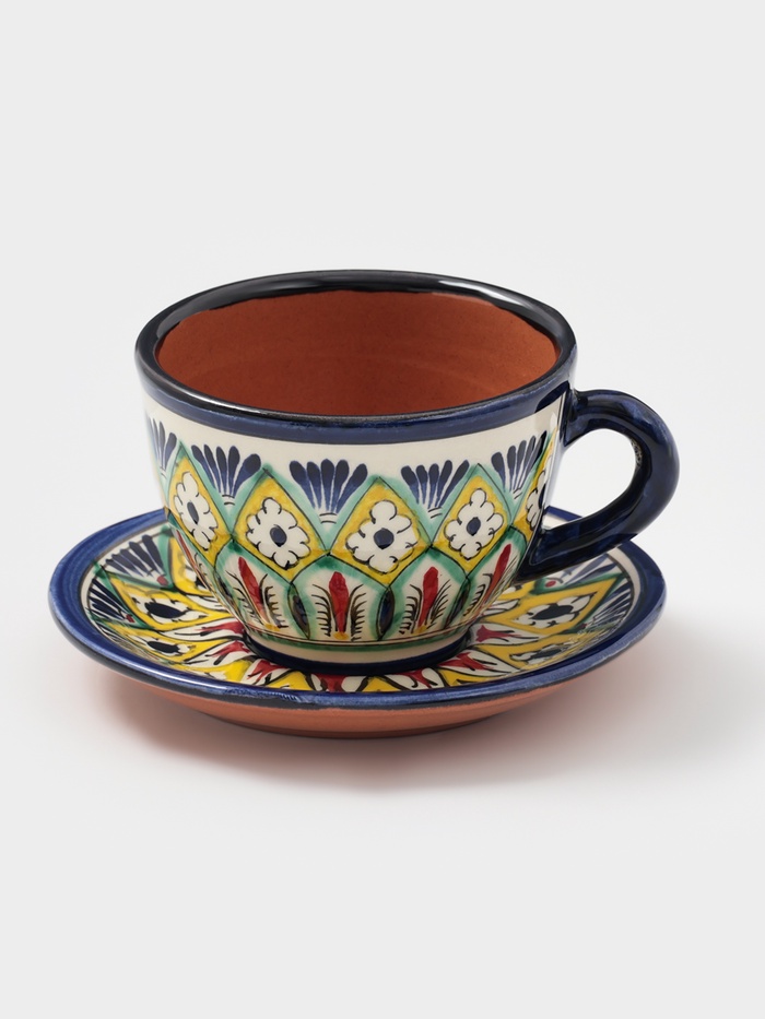 Эта синяя чайная пара из риштанской керамики с растительным орнаментом включает две предмета — чашку объемом 200 мл и блюдце. Ее ручная работа и изысканный дизайн делают ее достойным дополнением для любителей традиционной узбекской керамики и ценителей эстетики чаепития.