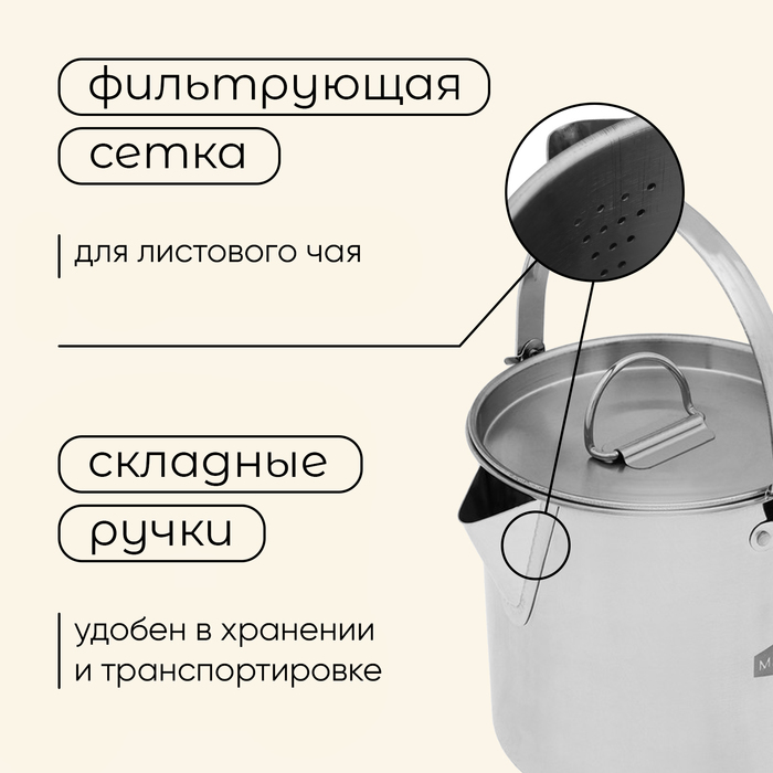 Походный чайник предназначен для кипячения и подогрева воды, заваривания чая и приготовления напитков. Изделие выполнено из коррозионно-стойкой стали и подойдёт для использования на костре и газовых плитах.