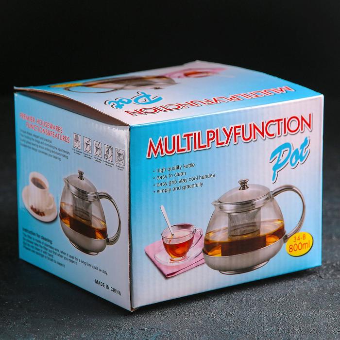 Чайник заварочный объемом 800 мл представлен прочной стеклянной колбой и дополнен металличсеким фильтром.