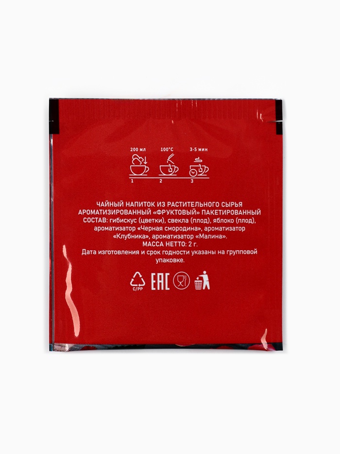 Состав: гибискус (цветки), свекла (плод), яблоко (плод), ароматизатор "Чёрная смородина", ароматизатор "Клубника", ароматизатор "Малина".
