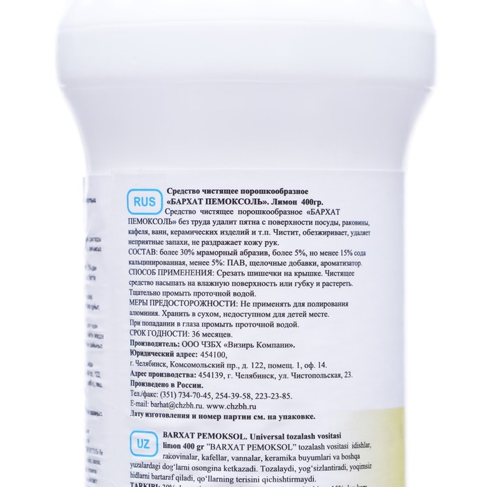 Способ применения: Срезать шишечки на крышке. Чистящее средство насыпать на влажную поверхность или губку и растереть. Тщательно промыть проточной водой.