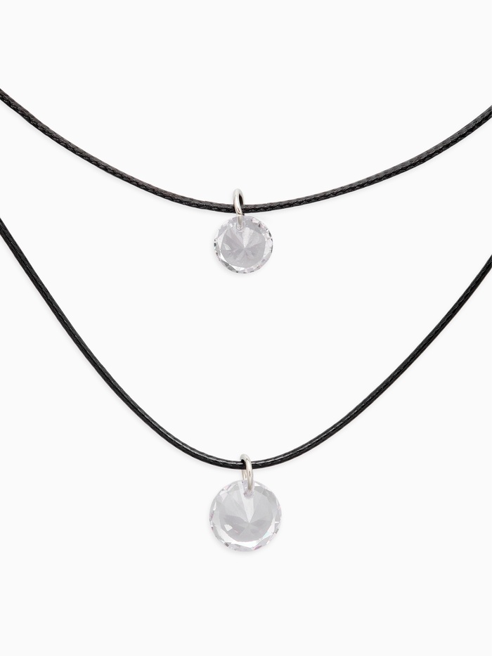 - Многослойность: две тонкие нити белой фактурной отделки мягко облегают шею, создавая игру световых бликов и усиливая привлекательность лица.