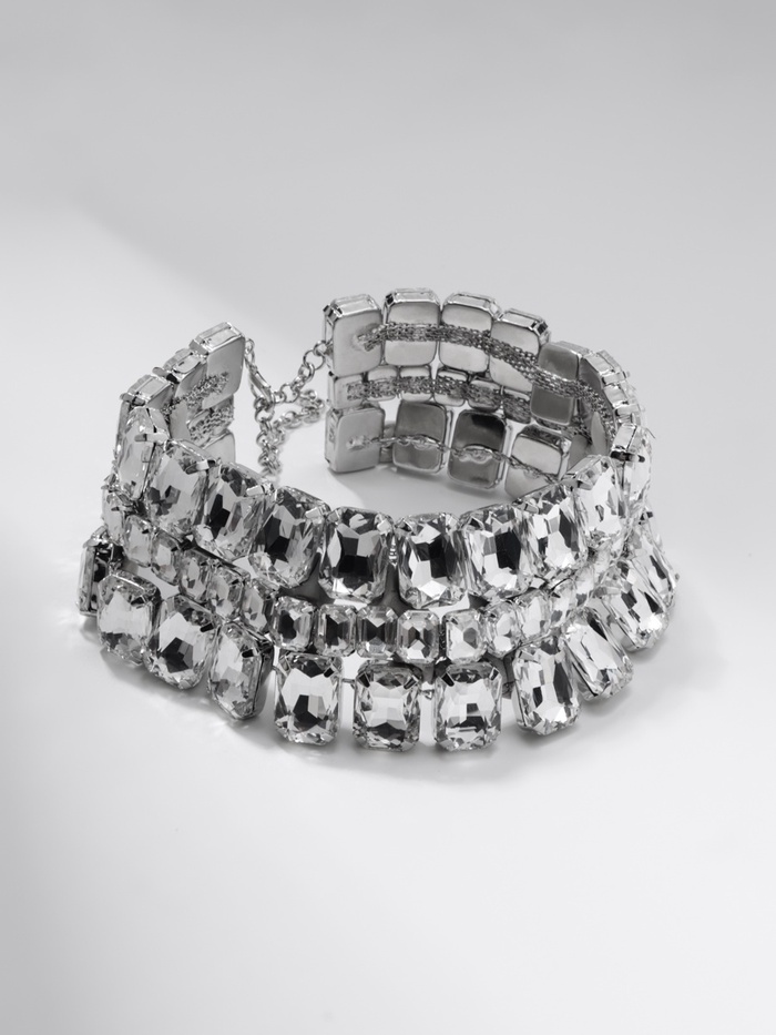 - Три нити с прозрачными стеклянными вставками и блестящими стразами формируют выразительный, но сдержанный дизайн.