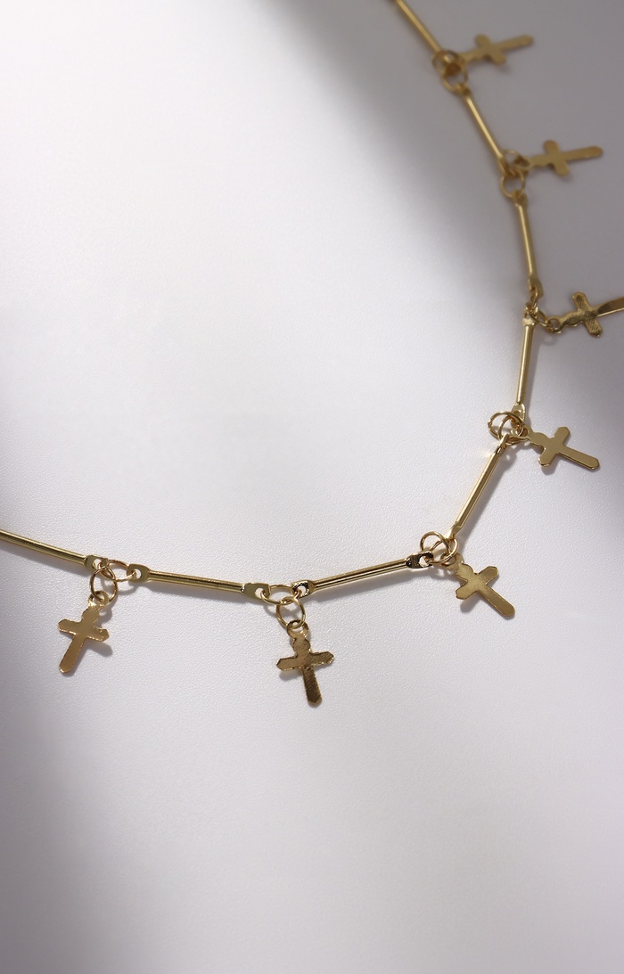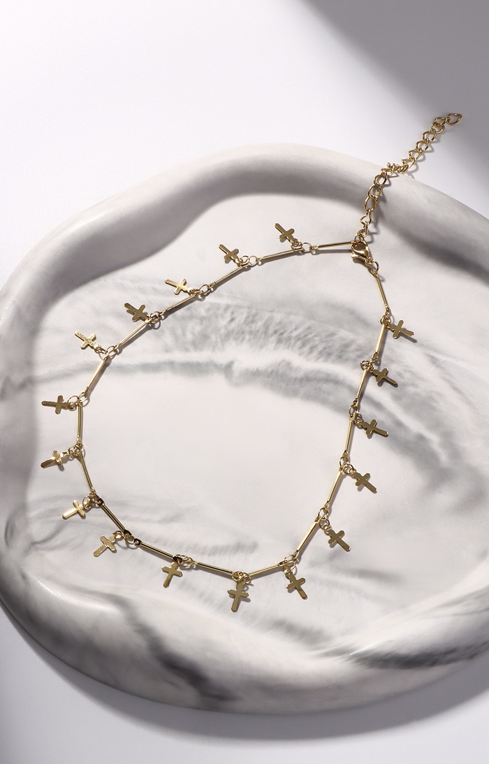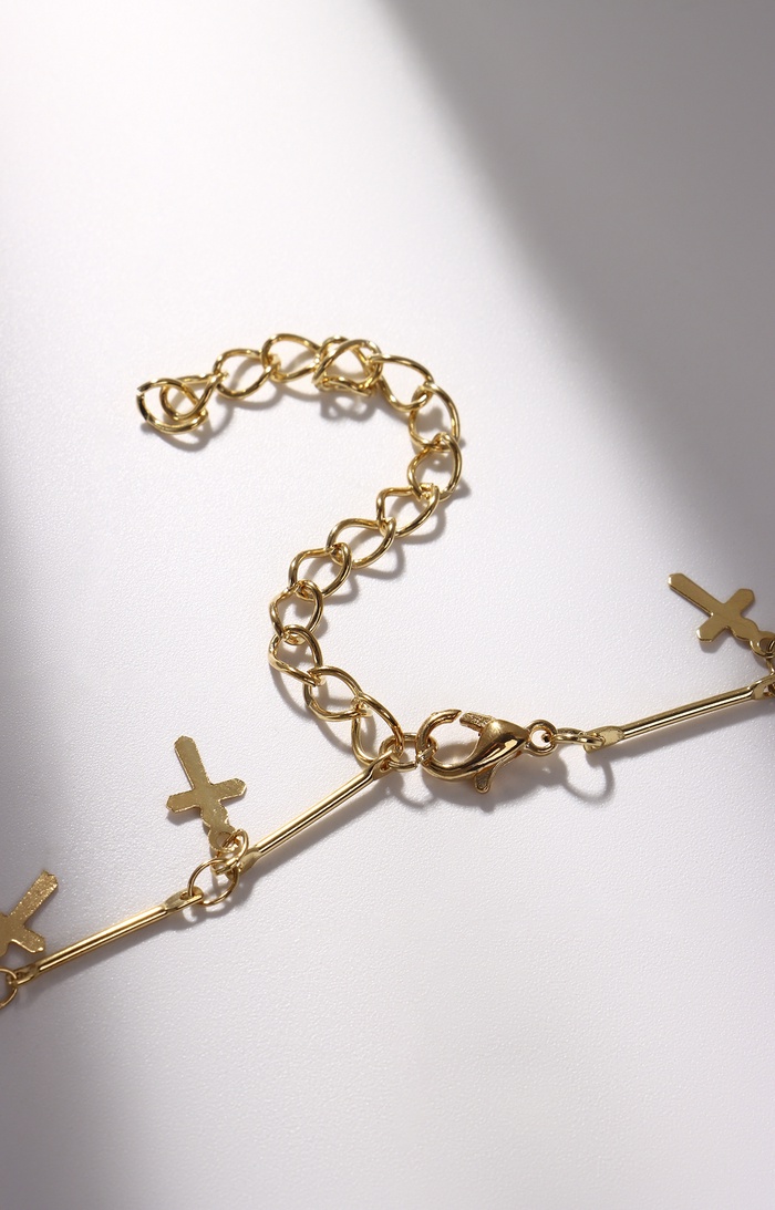 - Современный стиль: сочетание золотистого цвета и крестиков делает этот чокер актуальным для модных трендов 2025 года.