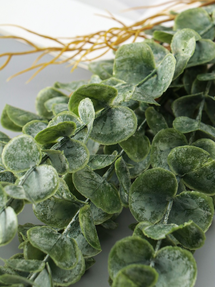 - Реалистичность и естественность: Ветвь эвкалипта покрыта мелкими округлыми листьями с фактурной поверхностью. Листва плотно сидит на стебле, создавая объем и натуральный вид. Оттенок зеленого глубокий и природный.