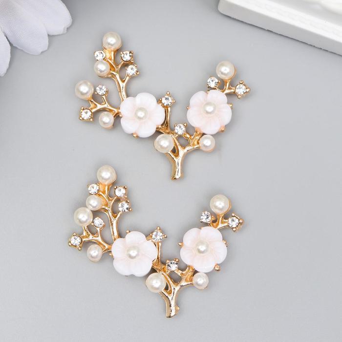 Декор для творчества металл «Цветочная ветвь», жемчужины, стразы, золото 3.5×4 см