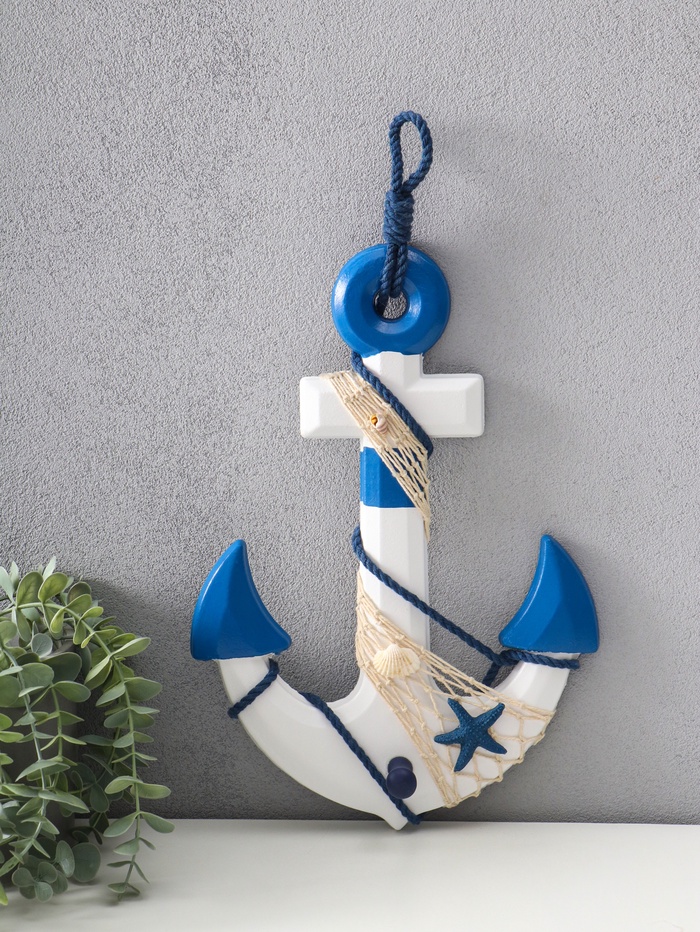 Декор настенный, панно с вешалкой «Якорь интерьерный с веревкой и звездой», бело-синий, 5×23×32 см