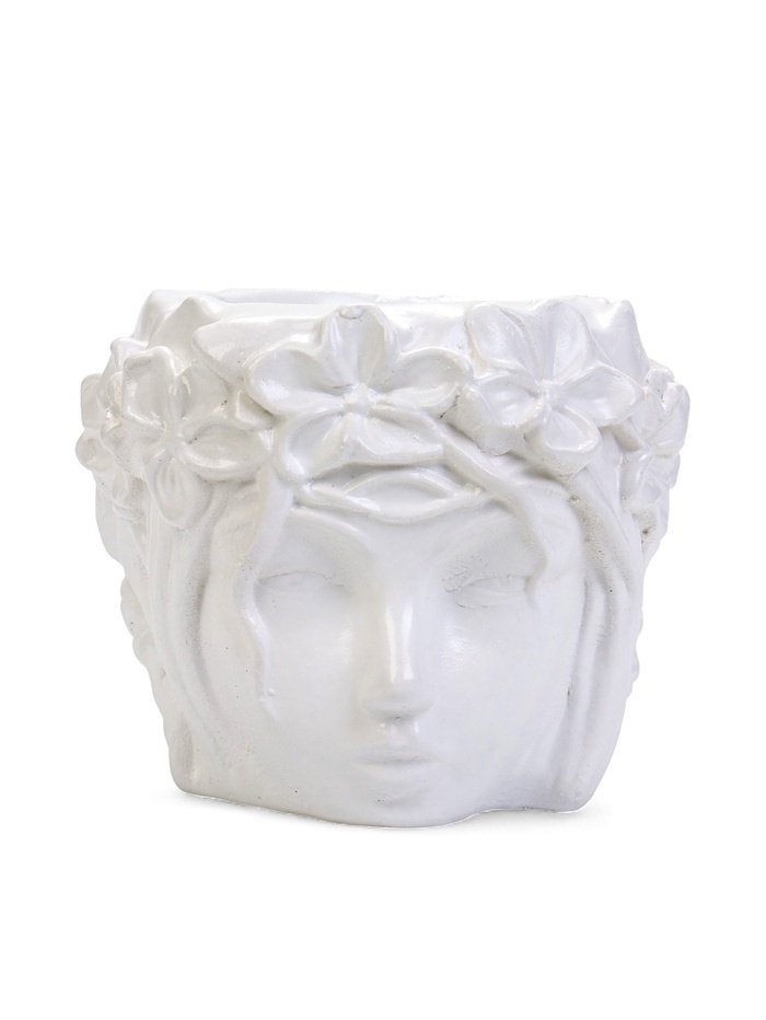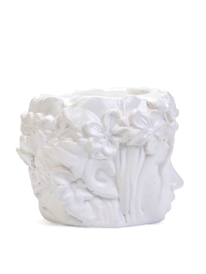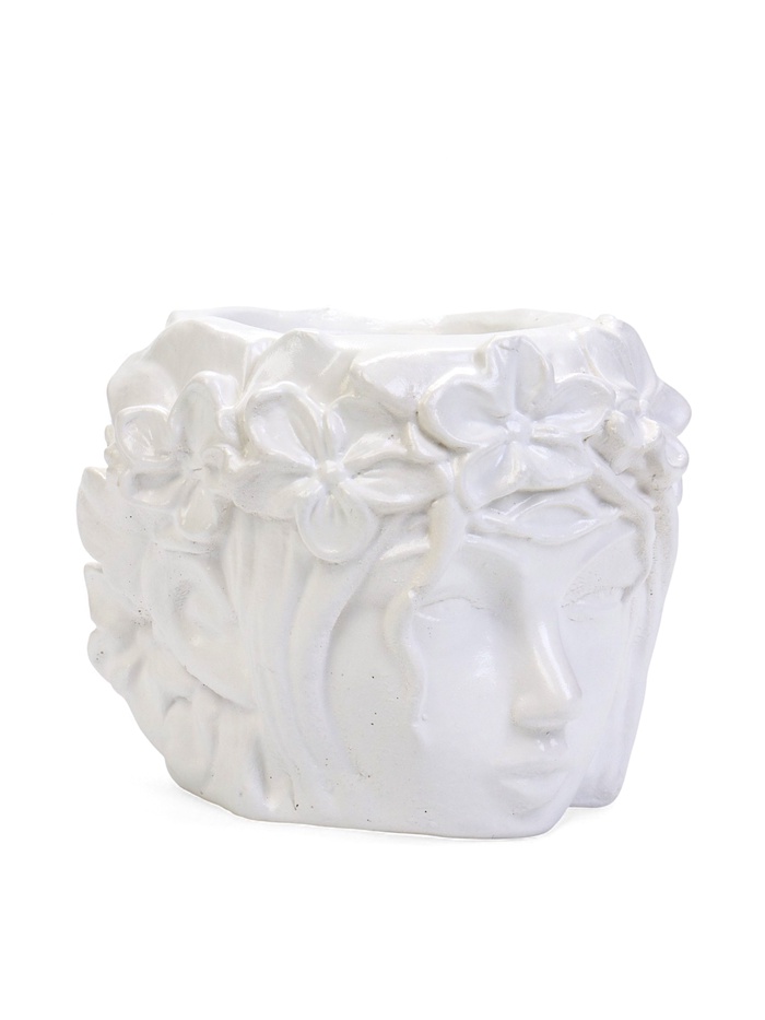 Декоративный горшок с объёмным образом лица — выразительный интерьерный акцент, сочетающий скульптурную форму и утончённую подачу. Пластика лица и венок из цветов создают спокойное, собранное настроение и делают предмет заметной частью композиции.