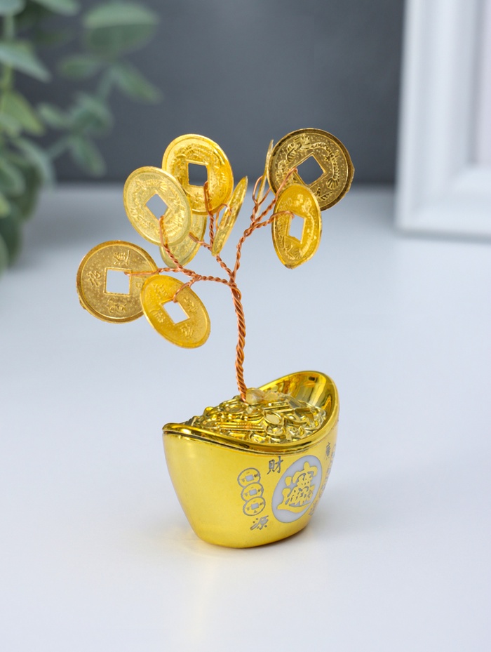 Этот сувенирный бонсай с золотыми монетами — символ процветания и стабильного финансового роста. Миниатюрное дерево из слитка и девяти монет привносит в интерьер энергию благополучия. Композиция служит стильным акцентом для рабочего кабинета, домашнего офиса или зоны отдыха, напоминая о важности мудрого управления ресурсами.