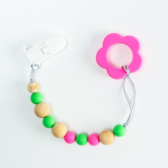 Изделие фиксируется на одежде ребёнка. На конце цепочки есть карабин, который зацепляется за кольцо пустышки. Надёжное крепление убережёт вещь от падения на пол, если малютка случайно выронит её изо рта.