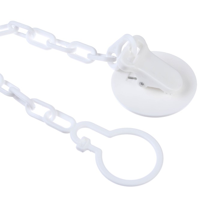 Изделие фиксируется на одежде ребёнка. На конце цепочки есть карабин, который зацепляется за кольцо пустышки. Надёжное крепление убережёт вещь от падения на пол, если малютка случайно выронит её изо рта.