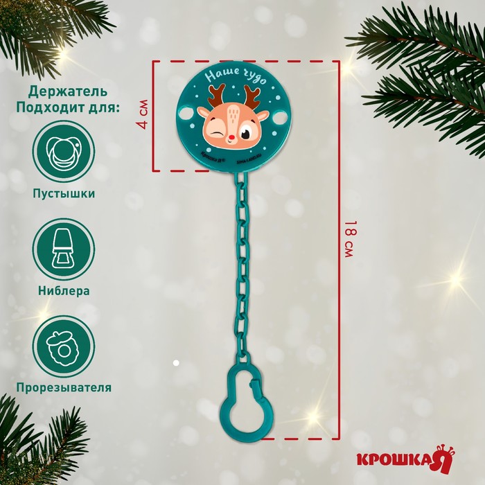 Изделие фиксируется на одежде ребёнка. На конце цепочки есть карабин, который зацепляется за кольцо пустышки. Надёжное крепление убережёт вещь от падения на пол, если малютка случайно выронит её изо рта.