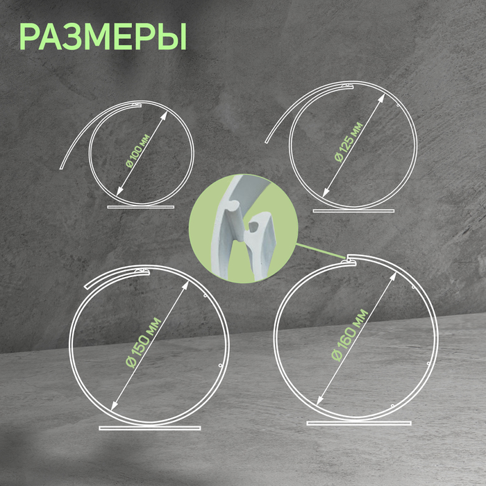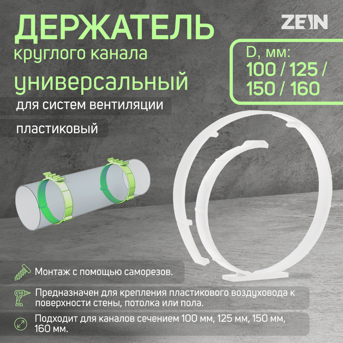 Держатель круглого канала применяется для приточной или вытяжной вентиляции различных помещений, для монтажа круглых каналов к стене, потолку и другой плоской поверхности. Держатель изготавливается из пластика белого цвета. Крепление держателя к плоской поверхности при помощи шурупов. Специальные защёлки обеспечивают надёжную фиксацию канала, с держателем. Присоединительные диаметры: 100, 125, 150, 160 мм.