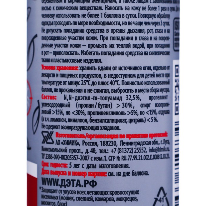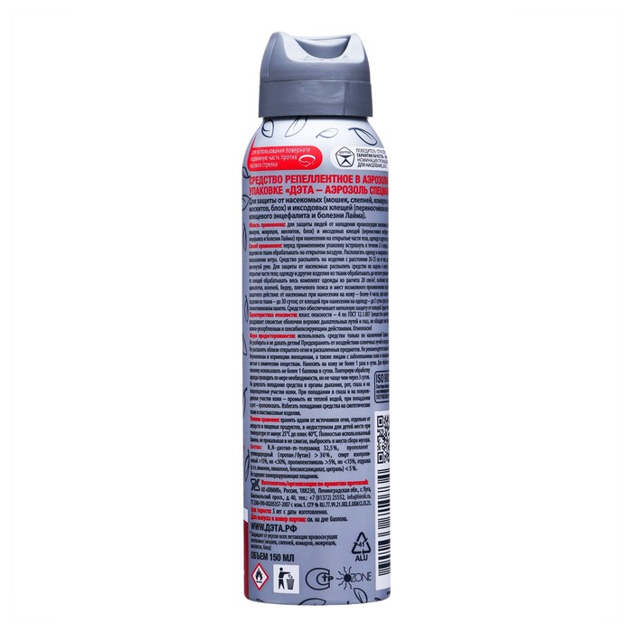 СоставN,N- диэтил-m-толуамид 32,5%, пропеллент углеводородный (пропан/бутан) >30%, спирт изопропиловый >15%, но < 30%, пропиленгликоль >5%, но < 15%, отдушкаРекомендации по применениюперед применением упаковку встряхнуть в течение 2-3 секунд.Одежду и другие изделия из ткани обрабатывать на открытом воздухе. Располагать одежду и направлять струю средства по направлению ветра. Средство распылять на изделия с расстояния 20-25 см от них, держа упаковку на вытянутой руке.Для защиты от насекомых распылить средство на ладонь и нанести, не втирая, на открытые ча-сти тела; одежду и другие изделия из ткани обрабатывать до легкого увлажнения.Для защиты от клещей обрабатывать весь комплект одежды из расчета 20 сек/м2, особенно тщательно – вокруг щиколоток, коленей, бедер, плечевого пояса и мест возможного проникновения клещей к телу. ОписаниеДля защиты людей от нападения кровососущих насекомых (мошек, слепней, комаров, мокрецов, москитов, блох) и иксодовых клещей (переносчиков возбудителей клещевого энцефалита и болезни Лайма) при нанесении на открытые части тела, одежду и другие изделия из ткани.Время защитного действия: от насекомых при нанесении на кожу – более 4 часов, при нанесении на одежду и изделия из ткани -  до 30 суток; от клещей при нанесении на одежду – до 5 суток.