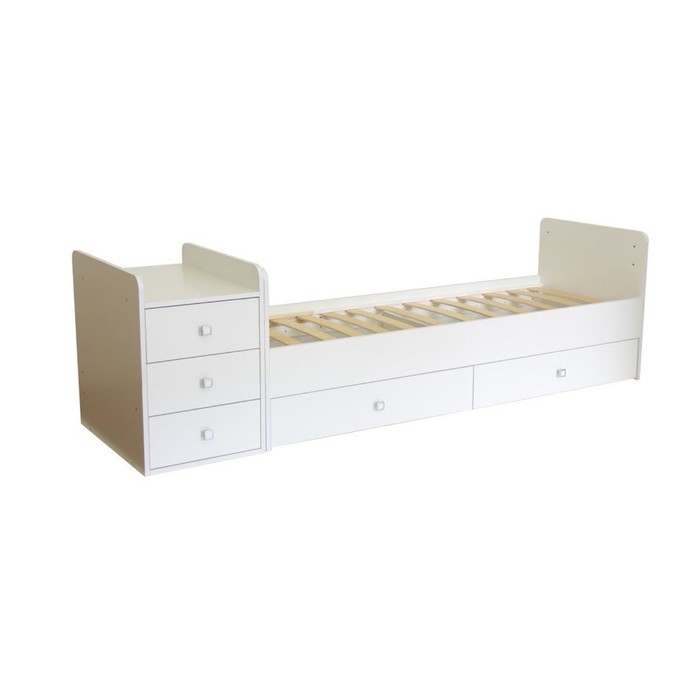 Кроватка детская - трансформер «Фея 1100» с пеленальным комодом и механизмом качания. Кроватки-трансформеры подходят в первую очередь, для квартир с небольшой площадью. Под кроваткой 2 выдвижных ящика, позволяющих удобно разместить вещи и игрушки малыша на небольшом пространстве.