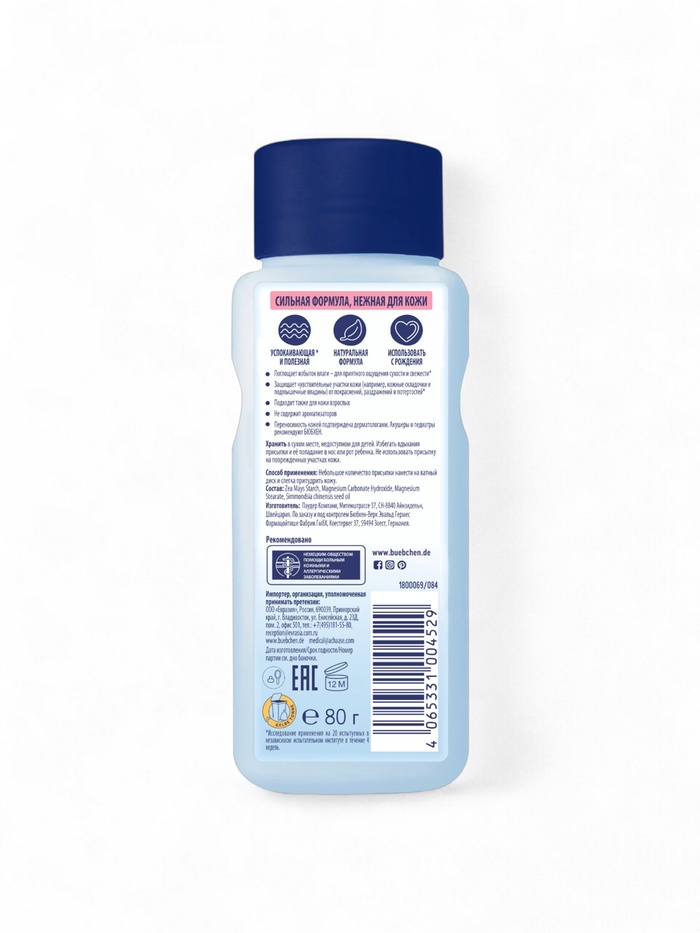 Нежная присыпка Bübchen создана для бережного ухода за чувствительной кожей малышей с первых дней жизни. Она помогает поддерживать кожу сухой, защищает от раздражений и покраснений, снижает риск появления опрелостей. Лёгкая текстура равномерно распределяется, не закупоривает поры и обеспечивает ощущение комфорта. Подходит для ежедневного использования после купания и смены подгузника.