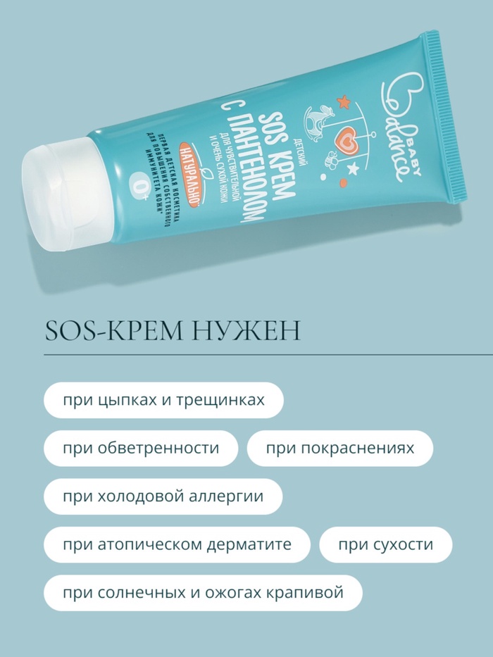 Детский SOS крем с пантенолом успокаивает раздраженную и покрасневшую кожу малыша, укрепляя ее естественный защитный барьер. Имеет противовоспалительный эффект, предотвращает появление зуда, способствует регенерации кожи при длительном применении. Активные компоненты: пантенол, масло ши и пребиотик оказывают питательное и смягчающее действие, способствуют глубокому увлажнению, защищают кожу и поддерживают ее здоровую микрофлору. Составы Baby Balance — натуральные и не содержат силиконов, красителей, парабенов и минерального масла. Гипоаллергенно и рекомендовано дерматологами с первых дней жизни.