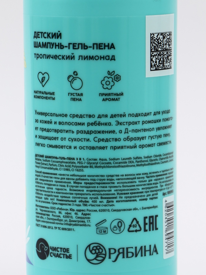 Нежное очищающее средство 3 в 1 для купания малышей: мягко очищает кожу и волосы, дарит аромат лета и хорошее настроение. Подходит для использования в качестве шампуня, геля для душа и пены для ванны. Объем: 400 мл. Аромат: тропический лимонад.