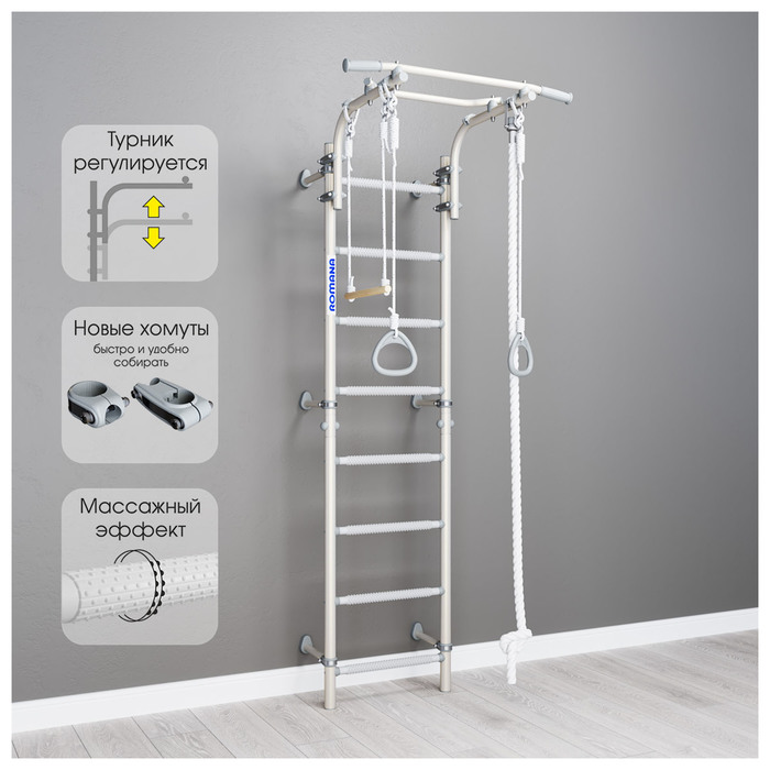 Детский спортивный комплекс ROMANA Next Pastel — это стильный редизайн самой популярной модели в линейке шведских стенок. Спокойные пастельные цвета, белый и серый, хорошо впишутся в современный интерьер.