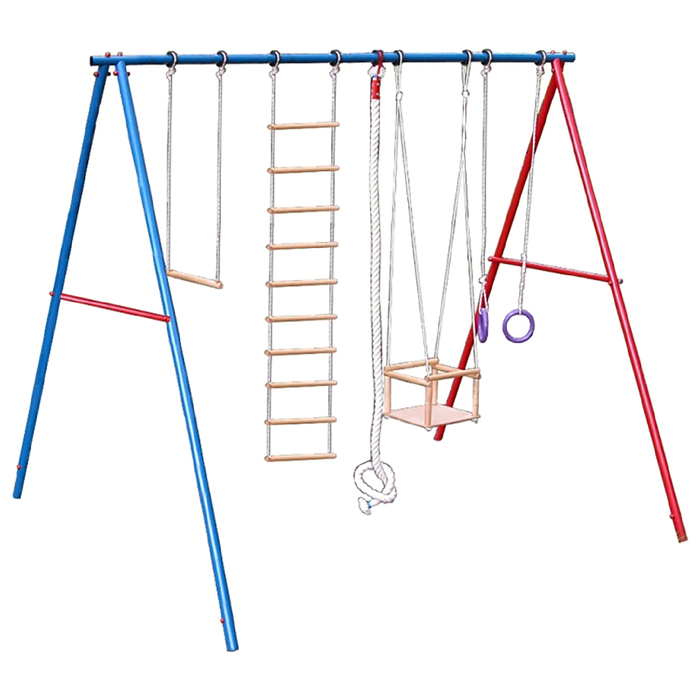 - комплектация: пластмассовые качели, канат цветной синтетический, кольца гимнастические пластмассовые, лестница веревочная, трапеция